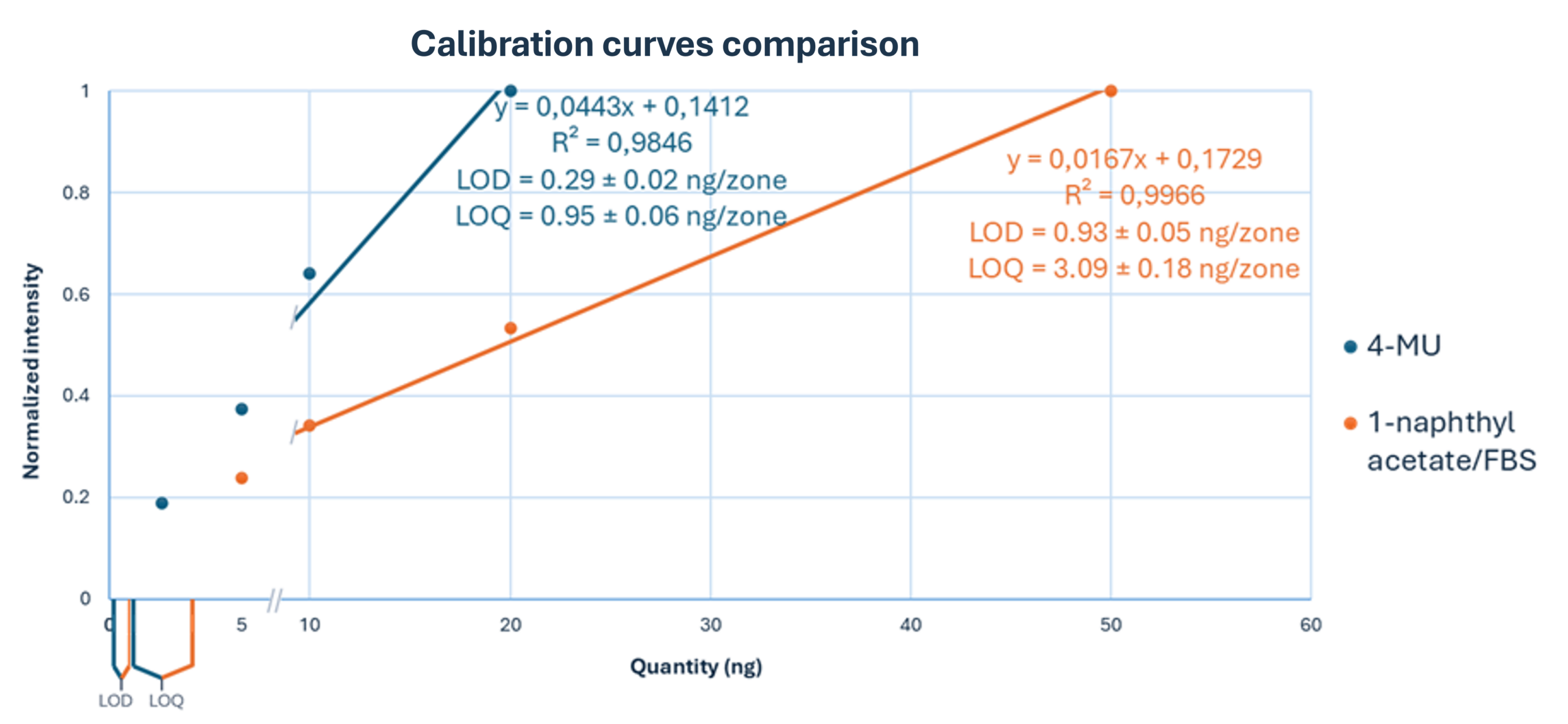 Comparison of calibration curves for 4-MU acetate and 1-naphthyl acetate/FBS. Normalized intensity is plotted against applied quantity (ng/zone). Linear regression parameters and corresponding LOD and LOQ values are indicated for each substrate.