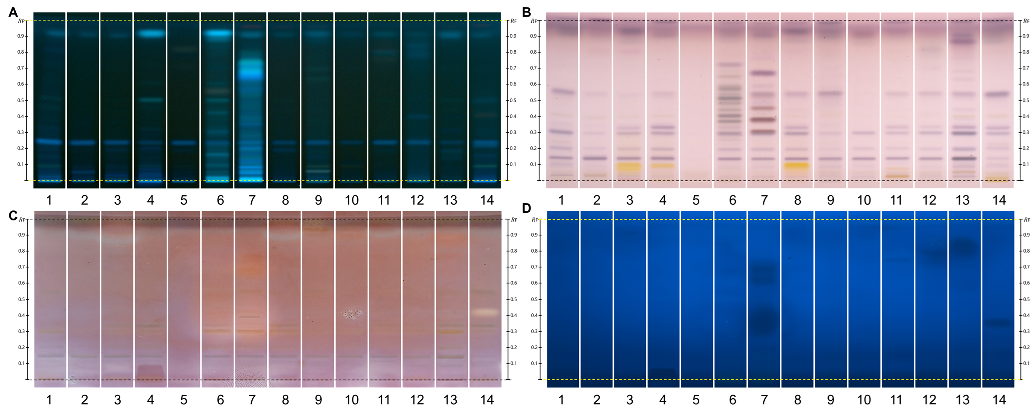 HPTLC fingerprints of the crude mushroom extracts and their fractions visualized under four detection conditions. (A) UV 366 nm prior to derivatization, (B) p-anisaldehyde post-derivatization, (C) naphthyl/FBS post-derivatization, and (D) UV 366 nm after derivatization with 4-MU acetate. Track 1: Agaricus silvicola; 2: Amanita muscaria; 3: Amanita phalloides; 4: Cortinarius orellanus; 5: Grifola frondosa; 6: Gymnopilus penetrans; 7: Hypholoma fasciculare; 8: Laccaria amethystine; 9: Lactarius blennius; 10: Lactarius subdulcis; 11: Tricholoma auratum; 12: Tricholoma saponaceum; 13: Tricholoma ustale; 14: Xerocomellus chrysenteron.