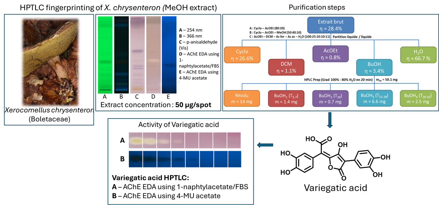 The extract of Xerocomellus chrysenteron displayed a strong AChE-inhibiting band under both detection methods. Purification of the active zone led to the isolation and identification of variegatic acid. The 4-MU acetate method additionally revealed weaker activities not visible with the chromogenic method, demonstrating its higher sensitivity. This example shows how the fluorescent probe improves detection while reliably guiding the isolation of genuine bioactive compounds.