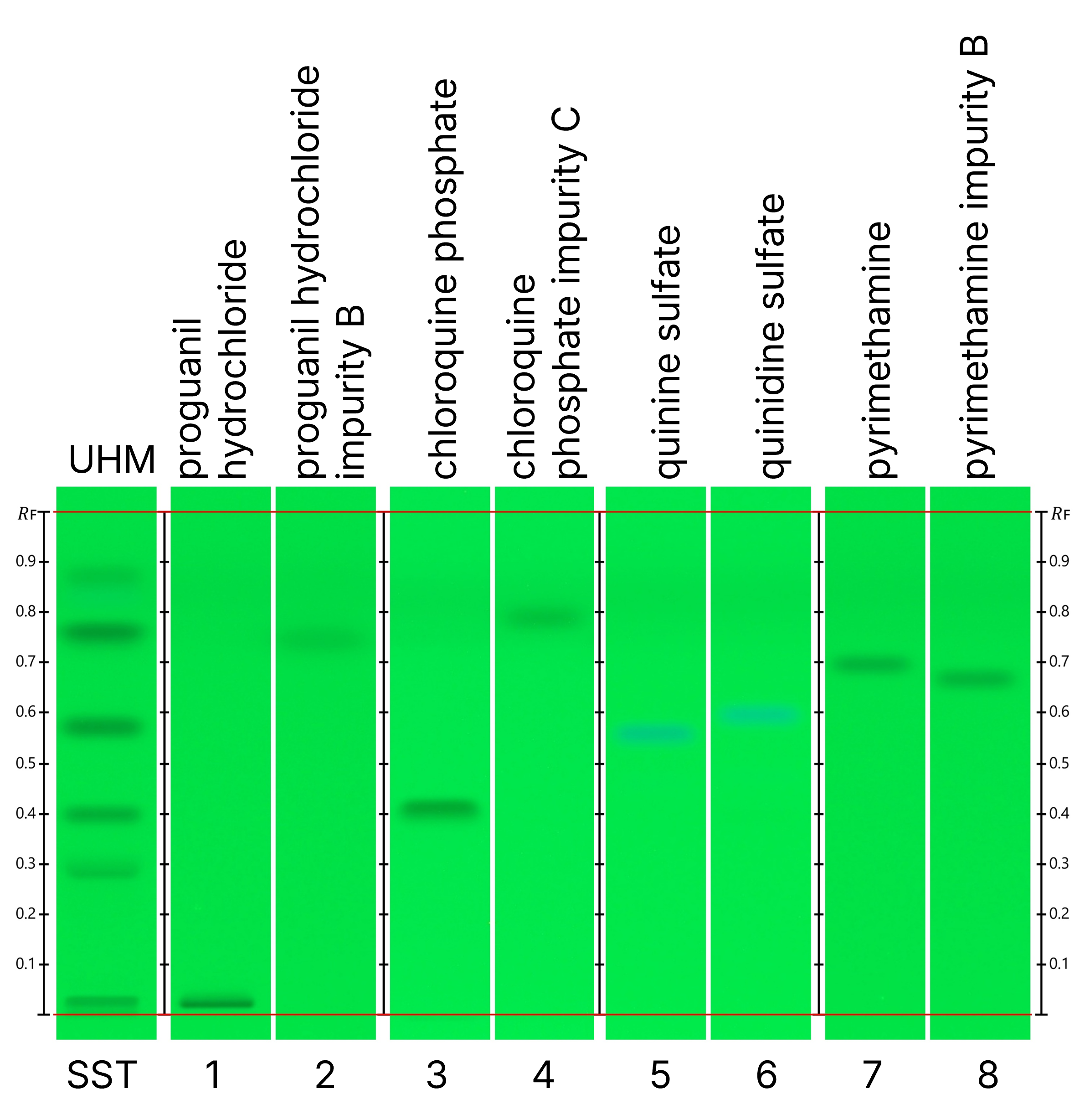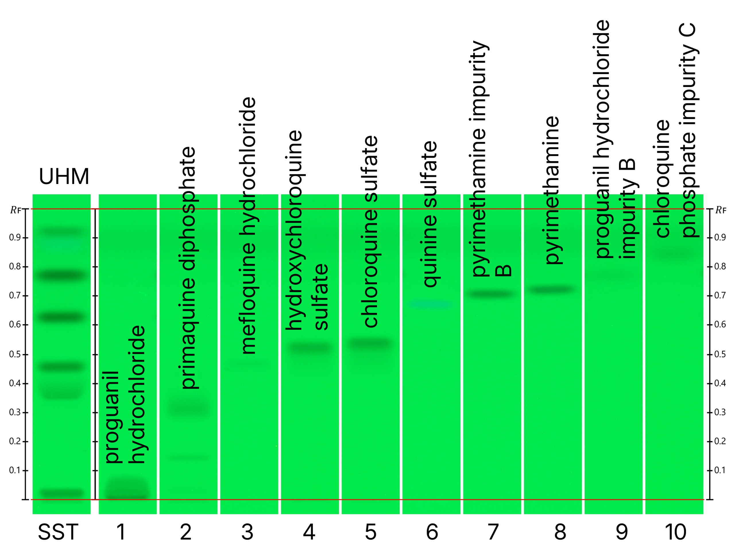 The volumes of the standard solutions were adjusted to achieve appropriate band quality. Proguanil hydrochloride was applied at 1.5 µL. Artemether, lumefantrine, artesunate, pyrimethamine, pyrimethamine impurity B, hydroxychloroquine sulfate, primaquine diphosphate, and chloroquine phosphate were applied at 2.0 µL. Chloroquine sulfate was applied at 3.0 µL. Atovaquone, chloroquine phosphate impurity C, and sulfadoxine were applied at 4.0 µL. Quinine sulfate, quinidine sulfate, and mefloquine hydrochloride were applied at 6.0 µL. Proguanil hydrochloride impurity B was applied at 8.0 µL. The application volume for UHM was 2.0 μL.