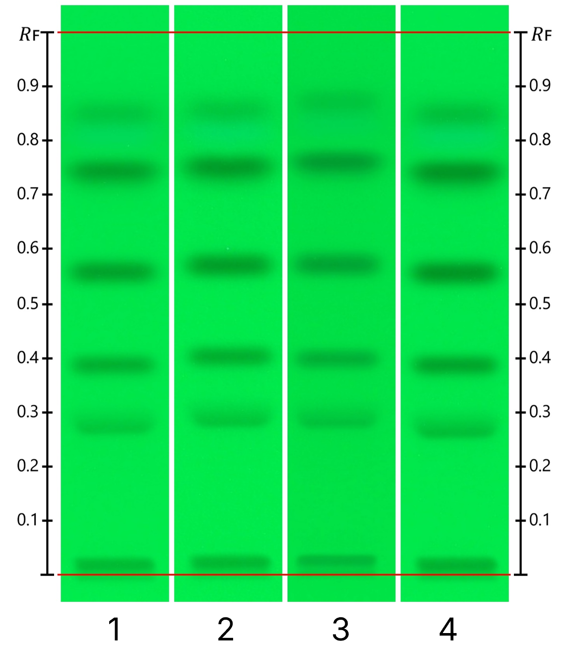 The method yielded clear and reproducible chromatographic fingerprints. The UHM was applied as SST to verify chromatographic performance prior to analysis. The obtained fingerprint confirmed proper plate development, adequate migration, and consistent separation conditions.