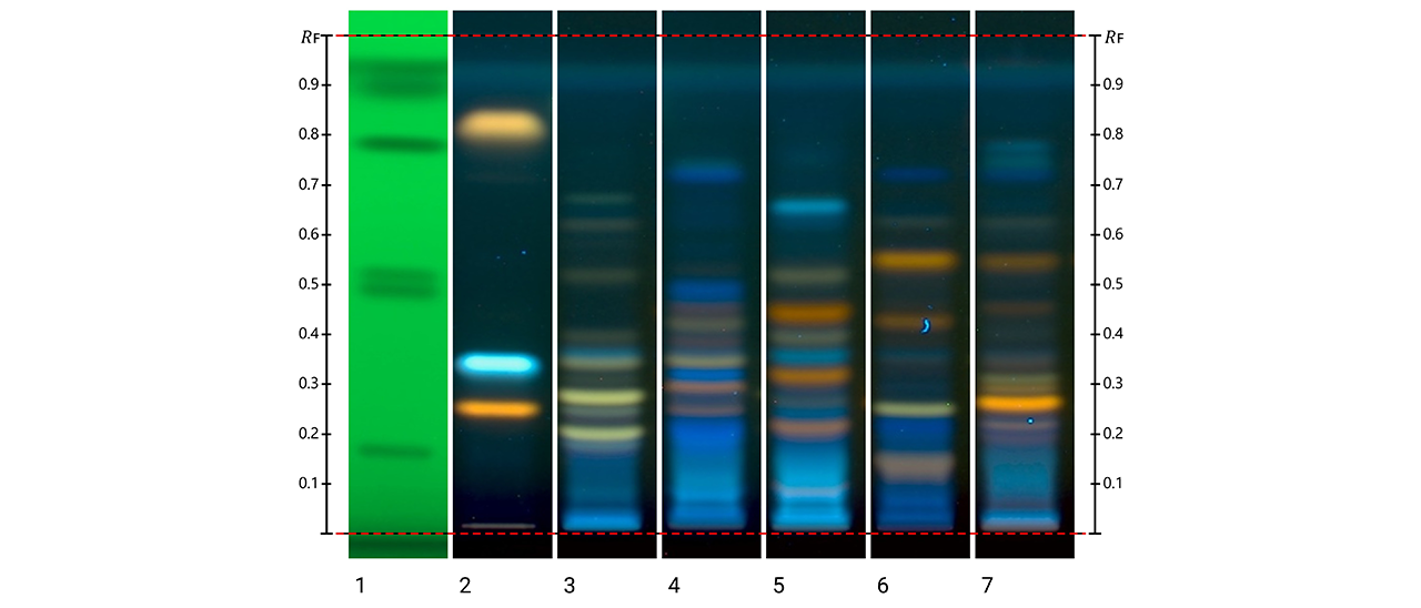 The images arecaptured using the TLC Visualizer 2 in UV 254 nm, UV 366 nm, and white light.