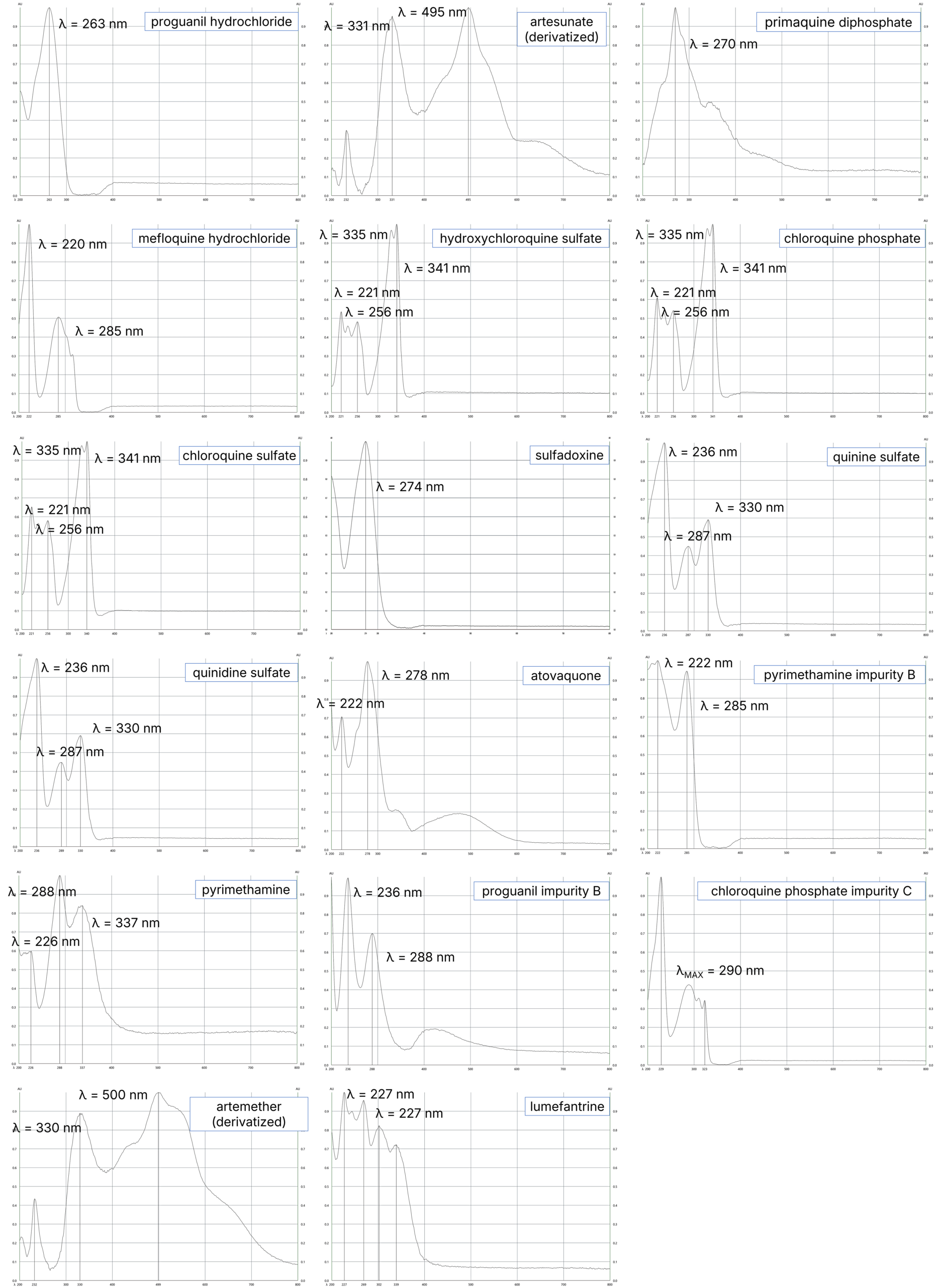 The investigated compounds included fourteen APIs and three related impurities: artemether, artesunate, atovaquone, chloroquine sulfate, chloroquine phosphate, hydroxychloroquine sulfate, lumefantrine, mefloquine hydrochloride, primaquine diphosphate, proguanil hydrochloride, pyrimethamine, quinidine sulfate, quinine sulfate, sulfadoxine, as well as pyrimethamine impurity B, proguanil hydrochloride impurity B, and chloroquine phosphate impurity C.