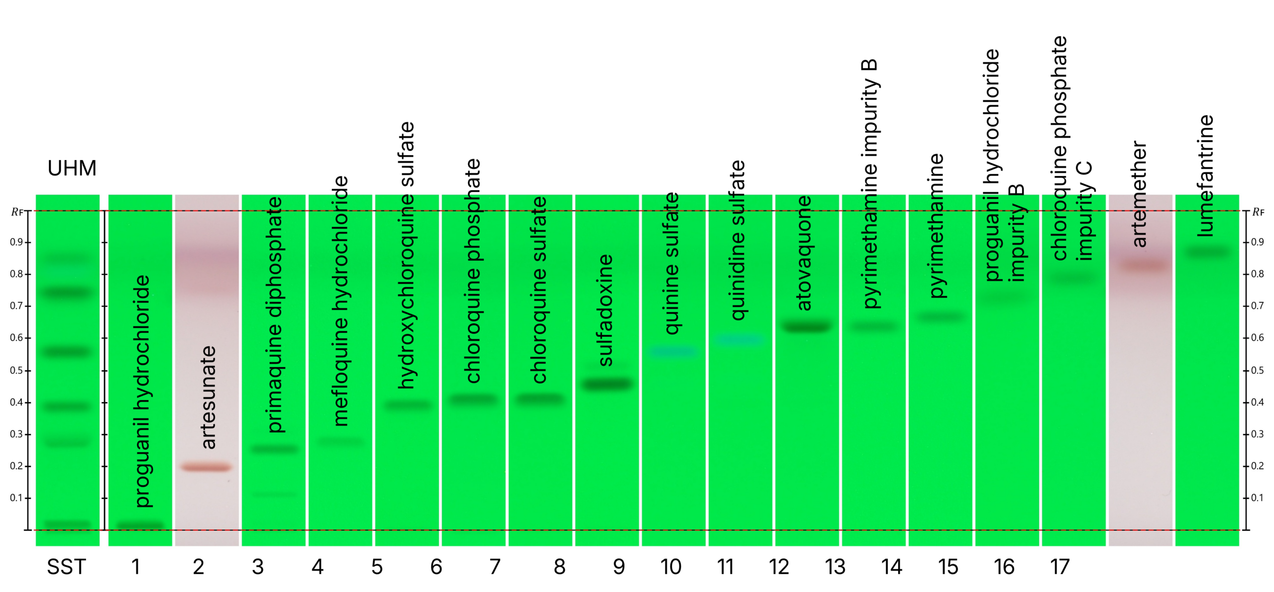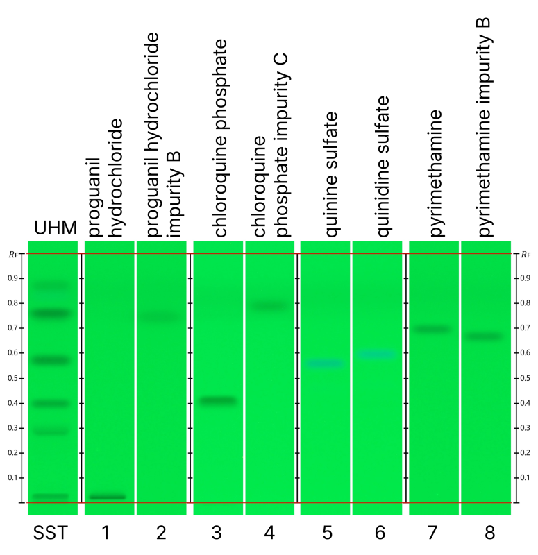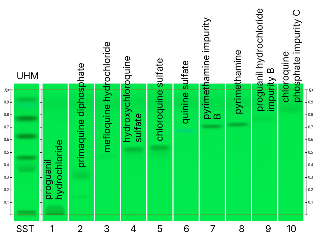 The volumes of the standard solutions were adjusted to achieve appropriate band quality. Proguanil hydrochloride was applied at 1.5 µL. Artemether, lumefantrine, artesunate, pyrimethamine, pyrimethamine impurity B, hydroxychloroquine sulfate, primaquine diphosphate, and chloroquine phosphate were applied at 2.0 µL. Chloroquine sulfate was applied at 3.0 µL. Atovaquone, chloroquine phosphate impurity C, and sulfadoxine were applied at 4.0 µL. Quinine sulfate, quinidine sulfate, and mefloquine hydrochloride were applied at 6.0 µL. Proguanil hydrochloride impurity B was applied at 8.0 µL. The application volume for UHM was 2.0 μL.