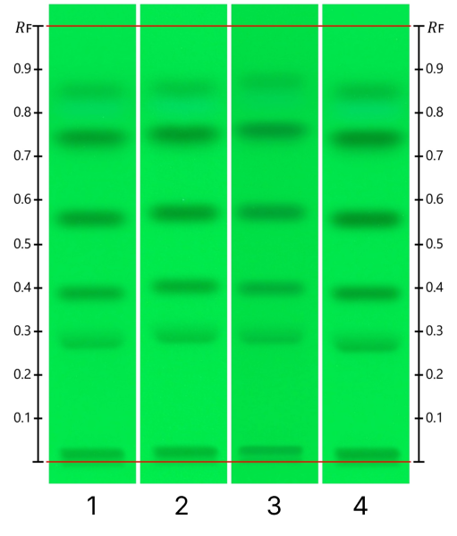 The method yielded clear and reproducible chromatographic fingerprints. The UHM was applied as SST to verify chromatographic performance prior to analysis. The obtained fingerprint confirmed proper plate development, adequate migration, and consistent separation conditions.