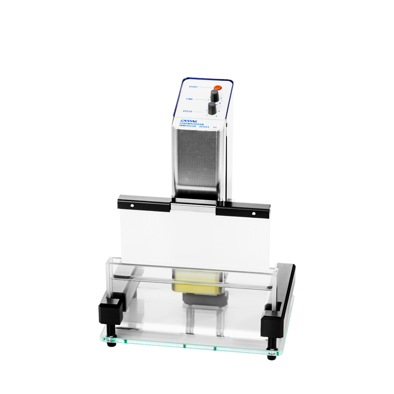 The CAMAG® Chromatogram Immersion Device 3 ensures precise and reproducible derivatization by automating the controlled dipping of TLC and HPTLC plates. It features adjustable dipping speeds (30–50 mm/s) and customizable immersion times (1–8 seconds or continuous), ensuring uniform coverage without tide marks.